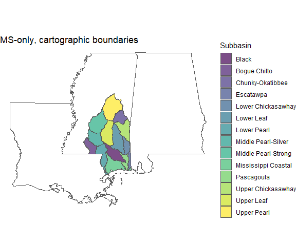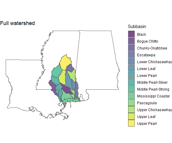 So outline_full contains everything. outline_land contains everything except the Mississippi Sound. outline_ms_full contains everything within the state of MS. outline_ms_land is that, but without the Mississippi Sound itself. Data frames starting with subbasins follow the same pattern, but are split into HUC8s.